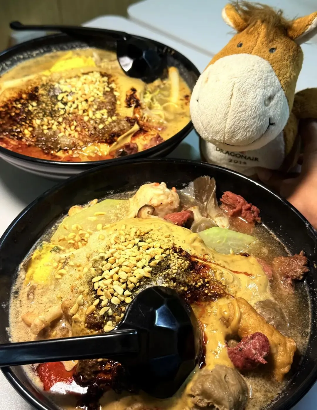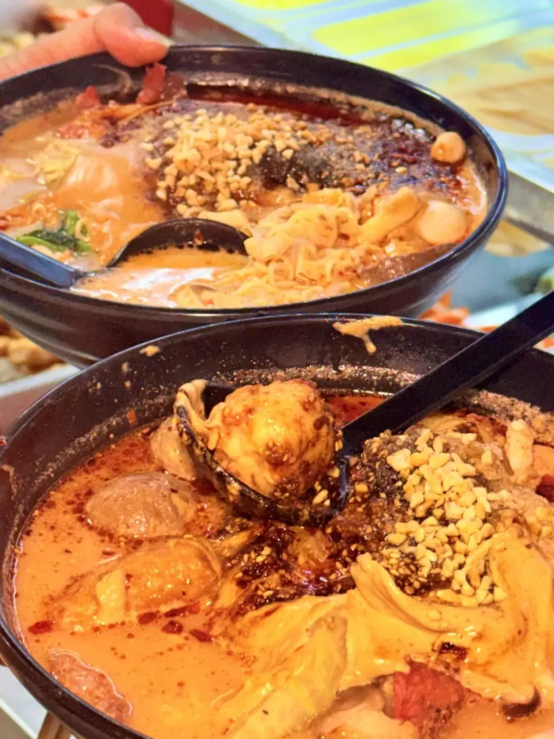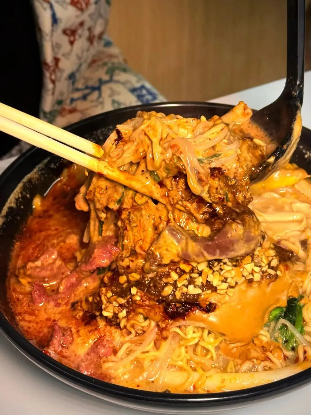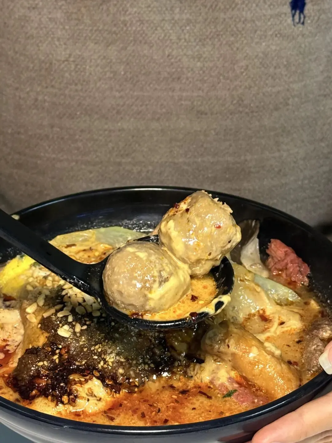 方便面被煮得软而不烂,裹着麻酱和红油,嗦起来劲道十足,每一口都带着满满的酱汁,香到跺脚;肥牛卷肥瘦相间,吸饱了汤汁的鲜美,和麻酱的醇厚完美融合,鲜嫩多汁;鱼豆腐Q弹入味,咬开后还能尝到淡淡的鲜香;油麦菜脆嫩爽口,中和了麻酱的厚重,解腻又清爽。我选的中辣刚好够劲,辣而不燥,越吃越上头,连配菜都舍不得放过。