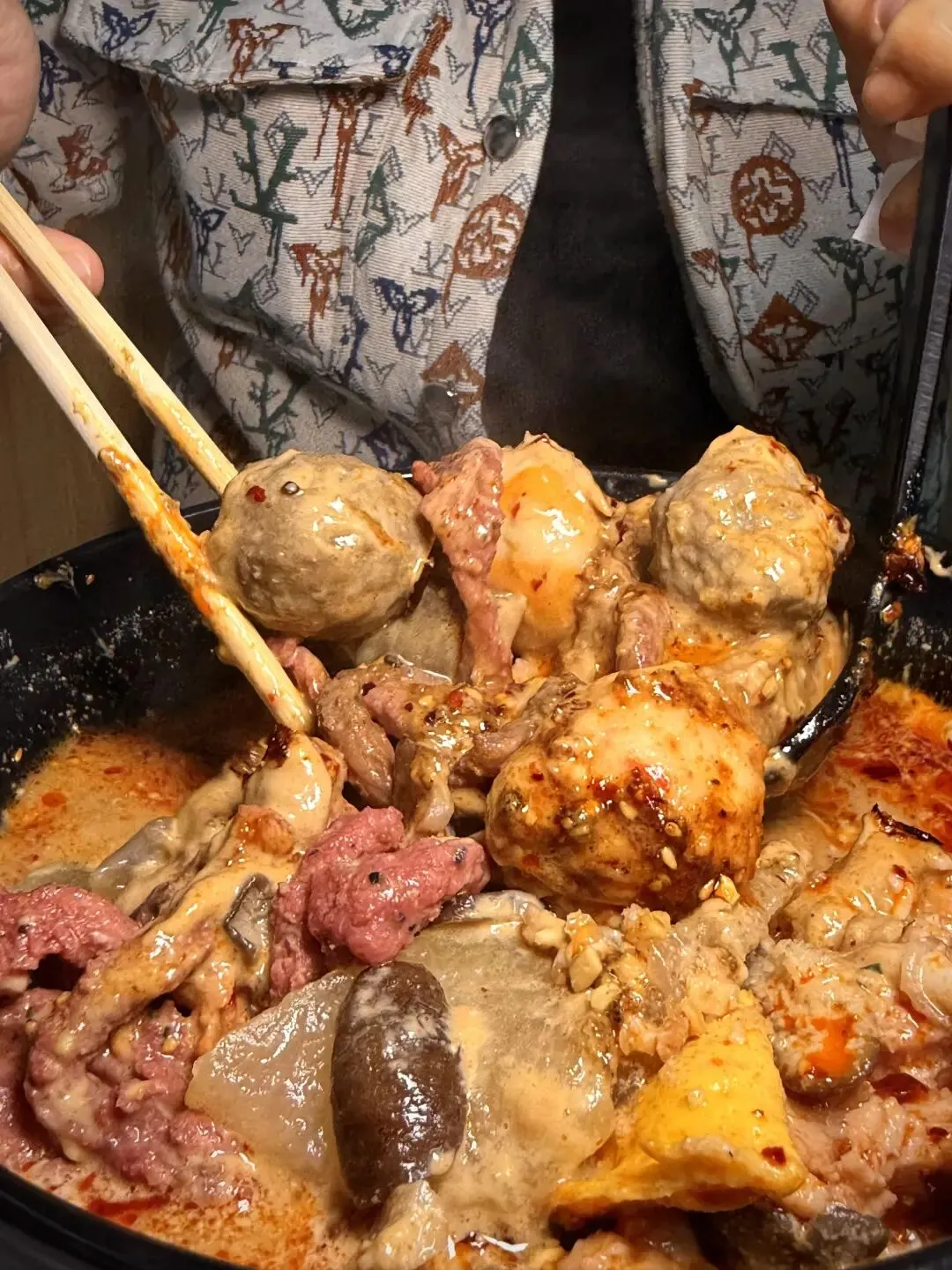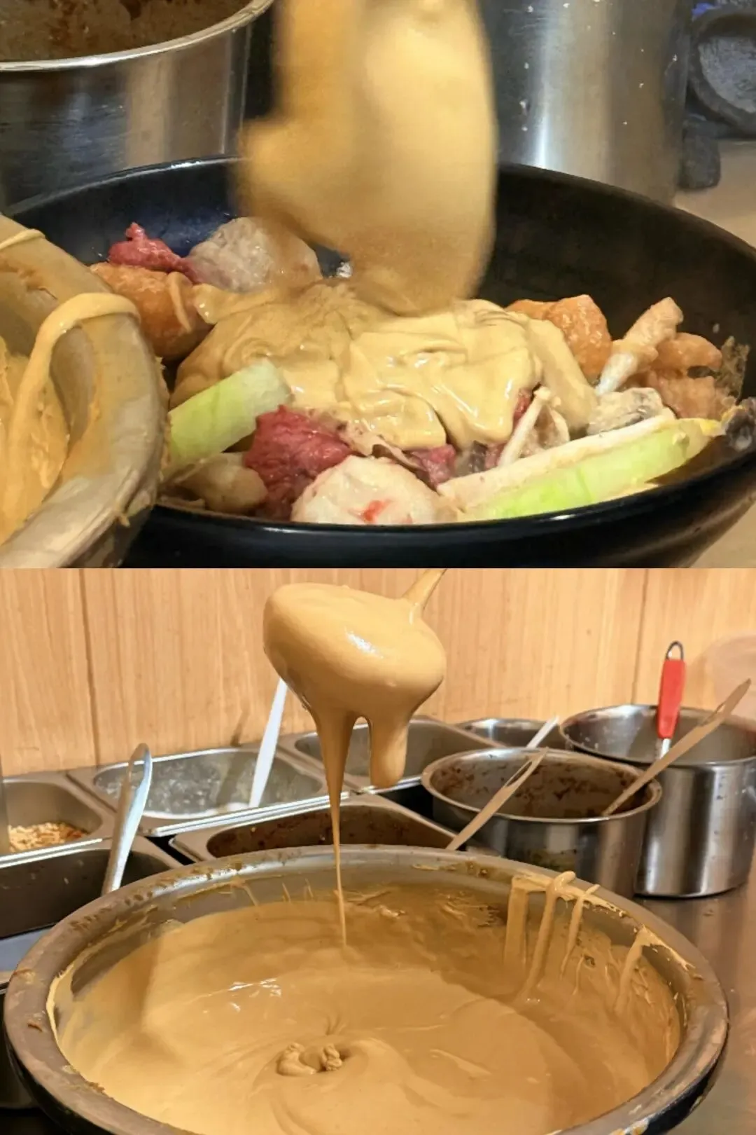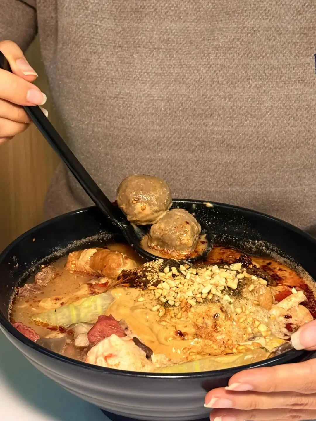 最绝的是汤底,吃完食材后,我忍不住叫王姐加了点米饭,把剩下的酱汁拌匀,米饭吸满了麻酱和红油的香气,咸香浓郁,连吃两碗都不腻,简直是灵魂吃法!店里的食客越来越多,大家边吃边聊天,有说有笑,热闹又亲切,像在自家食堂一样自在。