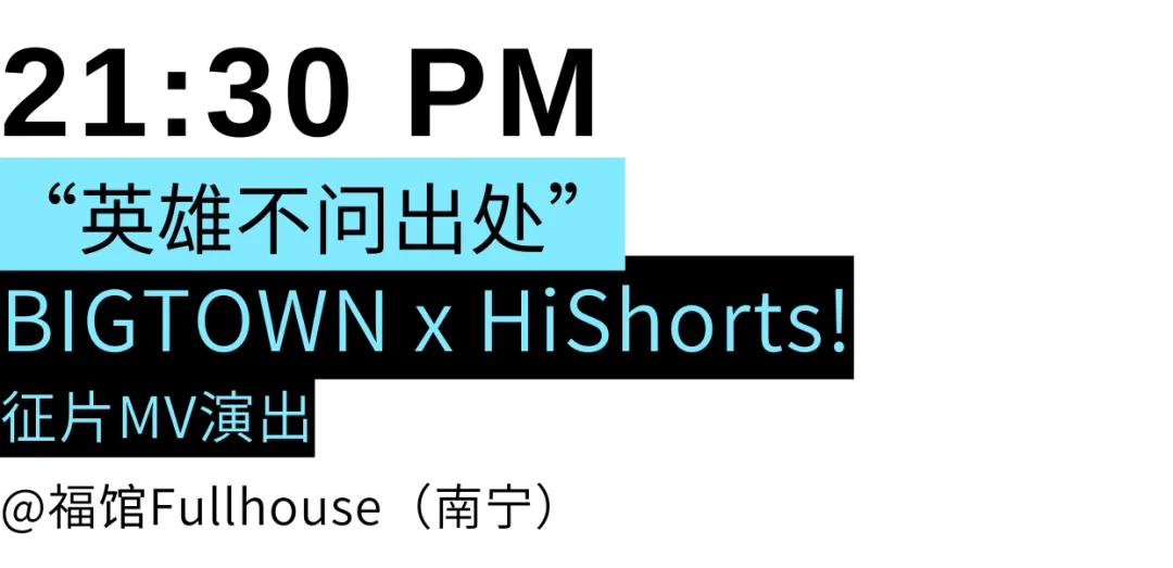 第二场演出从21:30开始至23:00,由今年HiShorts!征片MV的创作团队BIGTOWN登台,将这支今年一经发布感动了数十万人的MV里的BIGTOWN Cypher 2025将正式来到HiShorts!南宁影乐季现场!而其背后的故事也让这支MV增添了更深的情感厚度,不仅关乎兄弟之间用说唱纽结起来的真挚情谊,更关乎每一个像他们一样“十年饮冰,难凉热血”的平凡的你和我。(推送回顾:“英雄不问出处”—2025HiShorts!征片启动,联合说唱厂牌BIGTOWN发布一镜到底MV)