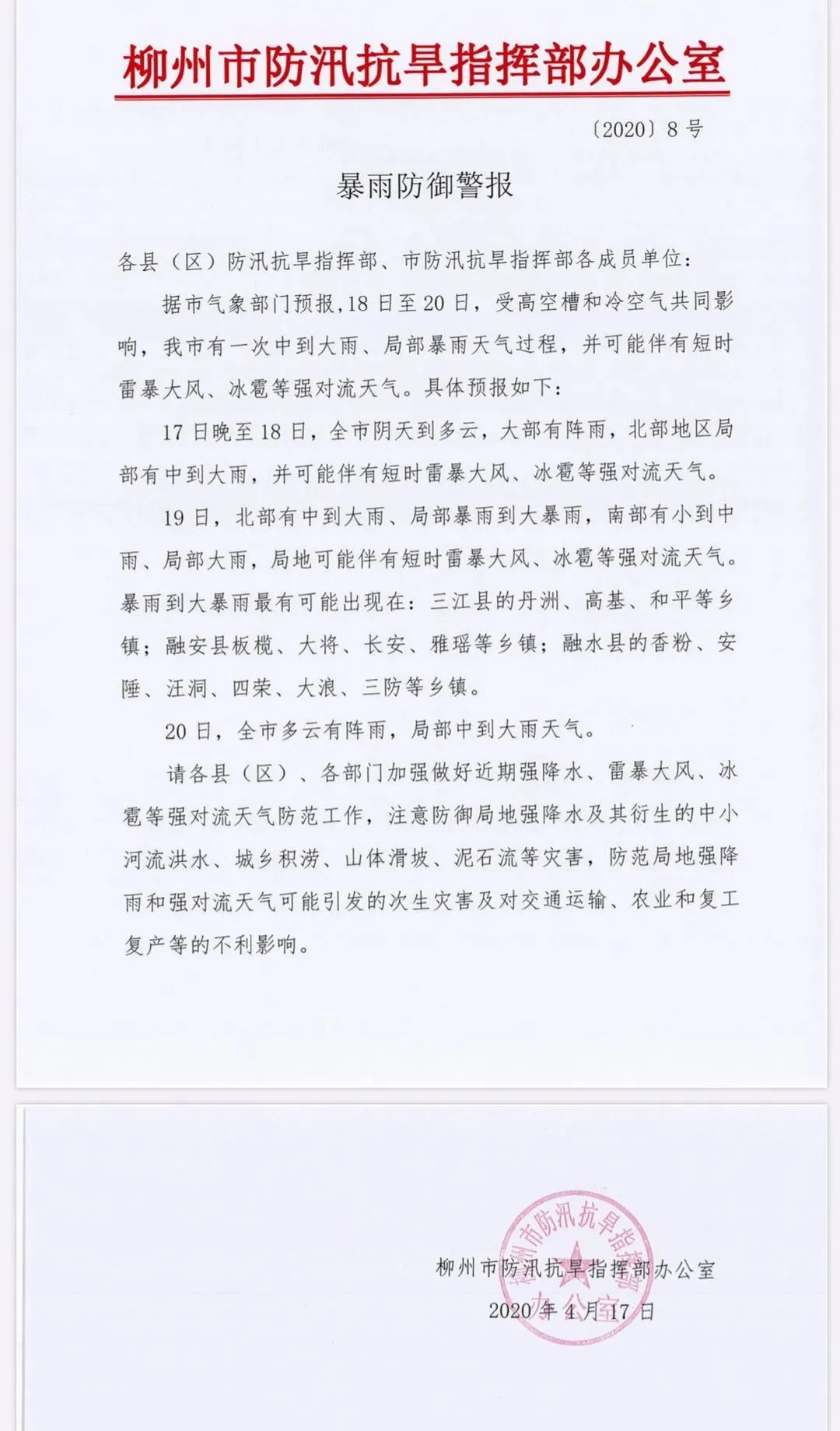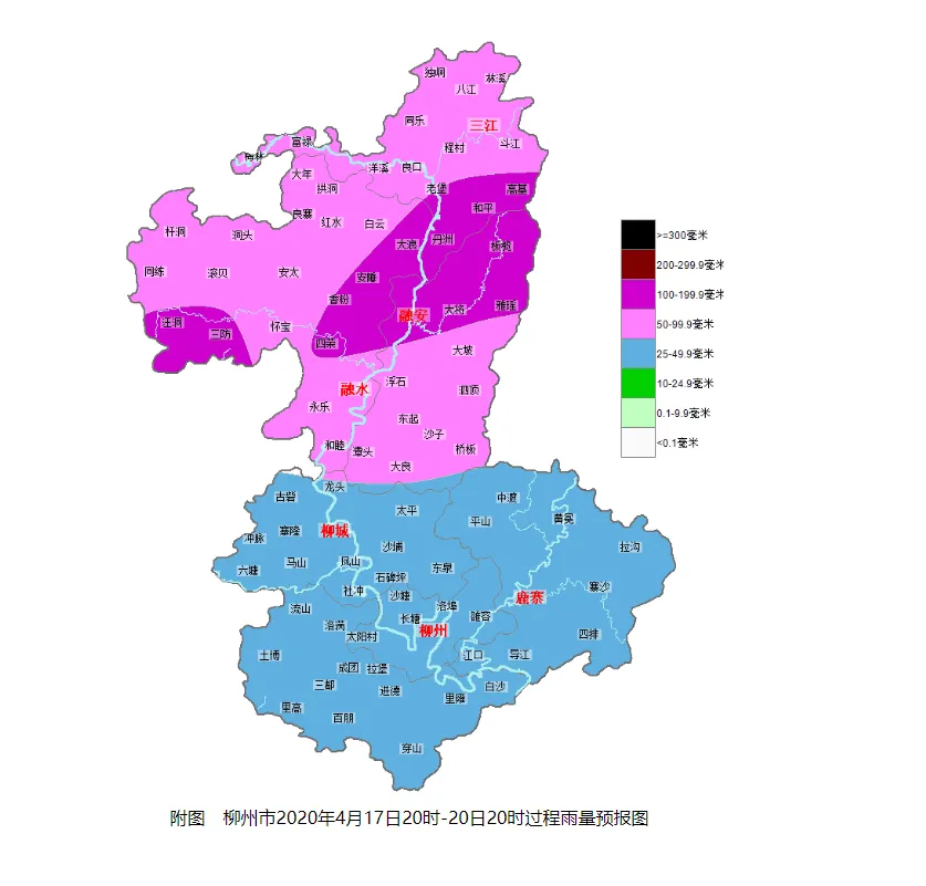 暴雨到大暴雨最有可能出现在:三江县的丹洲、高基、和平等乡镇,融安县板榄、大将、长安、雅瑶等乡镇,融水县的香粉、安陲、汪洞、四荣、大浪、三防等乡镇(附图)。