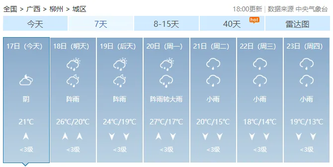 4月17日晚到18日,全市阴天到多云,大部有阵雨,南风2~3级;明天下午到傍晚北部地区局部有中到大雨,并可能伴有短时雷暴大风、冰雹等强对流天气;最低气温20~22℃,最高气温26~27℃。