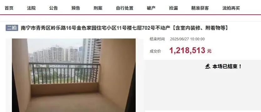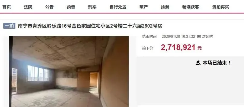 近日,在南宁市司法拍卖市场上,迎来了一宗非常抢手的房产拍卖,一套位于南宁市青秀区岭乐路16号金色家园住宅小区2号楼二十六层2602号房被拍卖。此次拍卖的是一套非常稀缺的顶层复式大房子,房子建筑面积达到了270.68平方米(套内建筑面积:206.42平方米,分摊建筑面积:64.26平方米),户型布局是一层两房两卫;二层三房两卫。这房子还带有一个超大露台,实际可利用面积更大,目前房子还是毛坯房,没有人装修入住过,同时已经拖欠了九千多元物业费了。该房产拍卖,房东涉及到一起刑事案件而被拍卖。