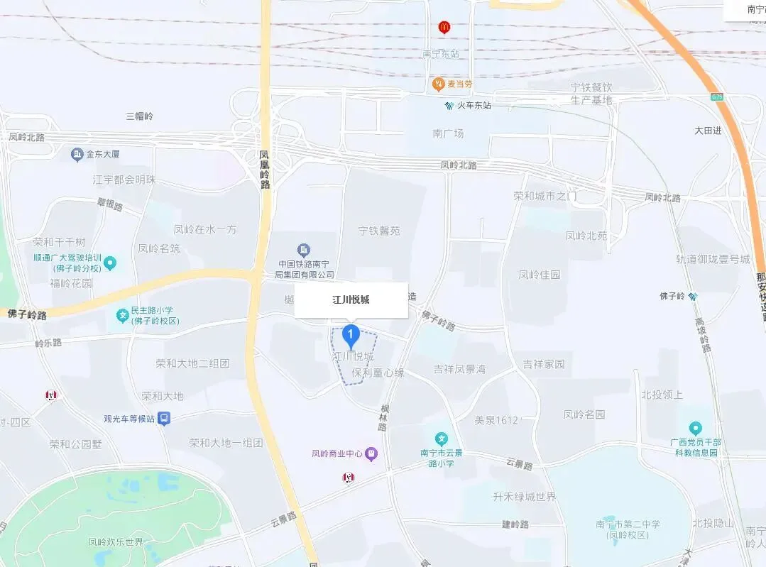 此次拍卖的房子,地段非常好,位于南宁市最炙手可热的凤岭北板块,所在小区也叫做江川悦城,小区斜对面就是枫林中学,然后北边到南宁东站都不到1公里距离。南边不远又是凤岭商业中心。小区附近优质学校比较多,除了枫林中学外,还有南宁市云景路小学、南宁市第二中学(凤岭校区)、凤岭北路中学等。