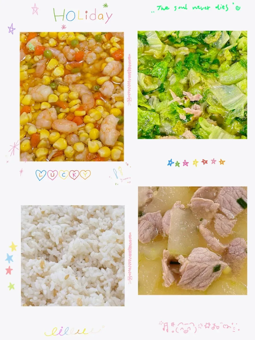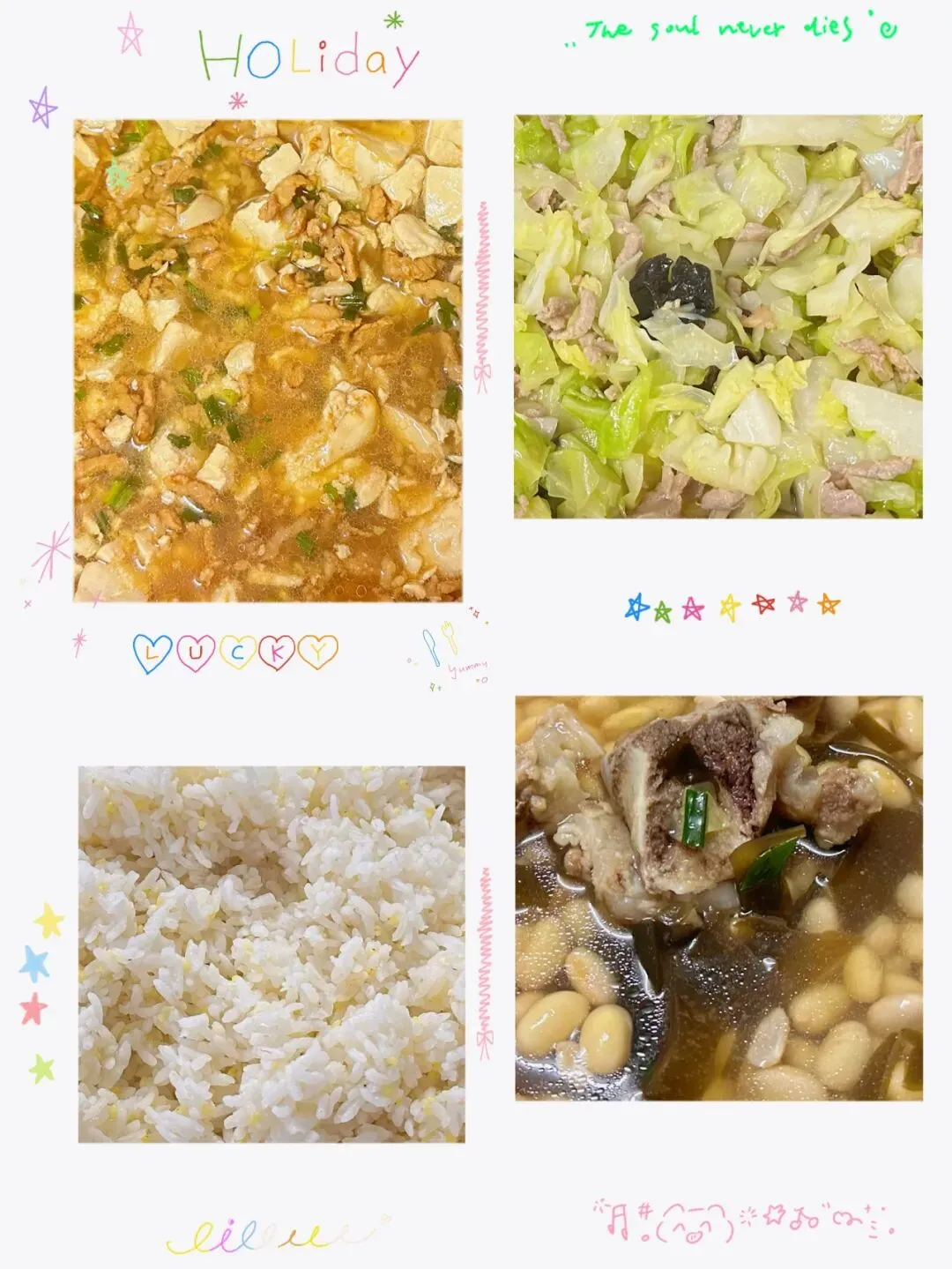 金银米饭、肉沫豆腐、包菜木耳炒肉丝、黄豆海带猪骨汤