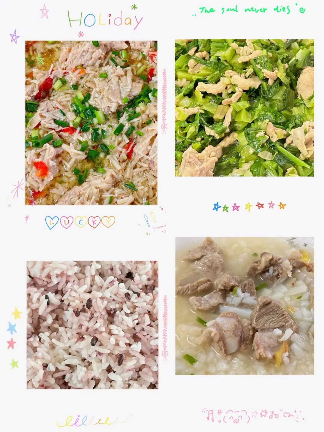 红米香米饭、土豆焖鸭、蚝油生菜、紫菜虾皮汤