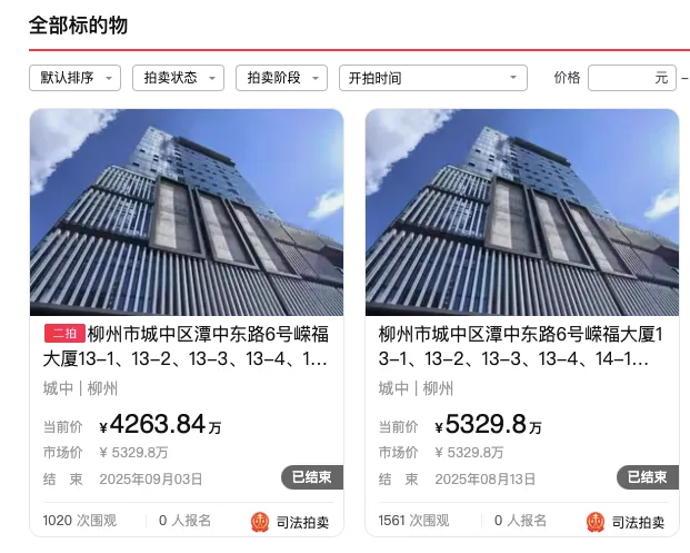 此前,嵘福大厦13—16层曾两次上架司法拍卖网,一拍起拍价5329.8万元,二拍起拍价4263.84万元,均因无人报名出价而流拍。