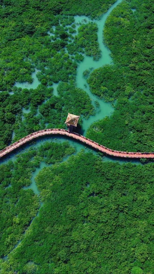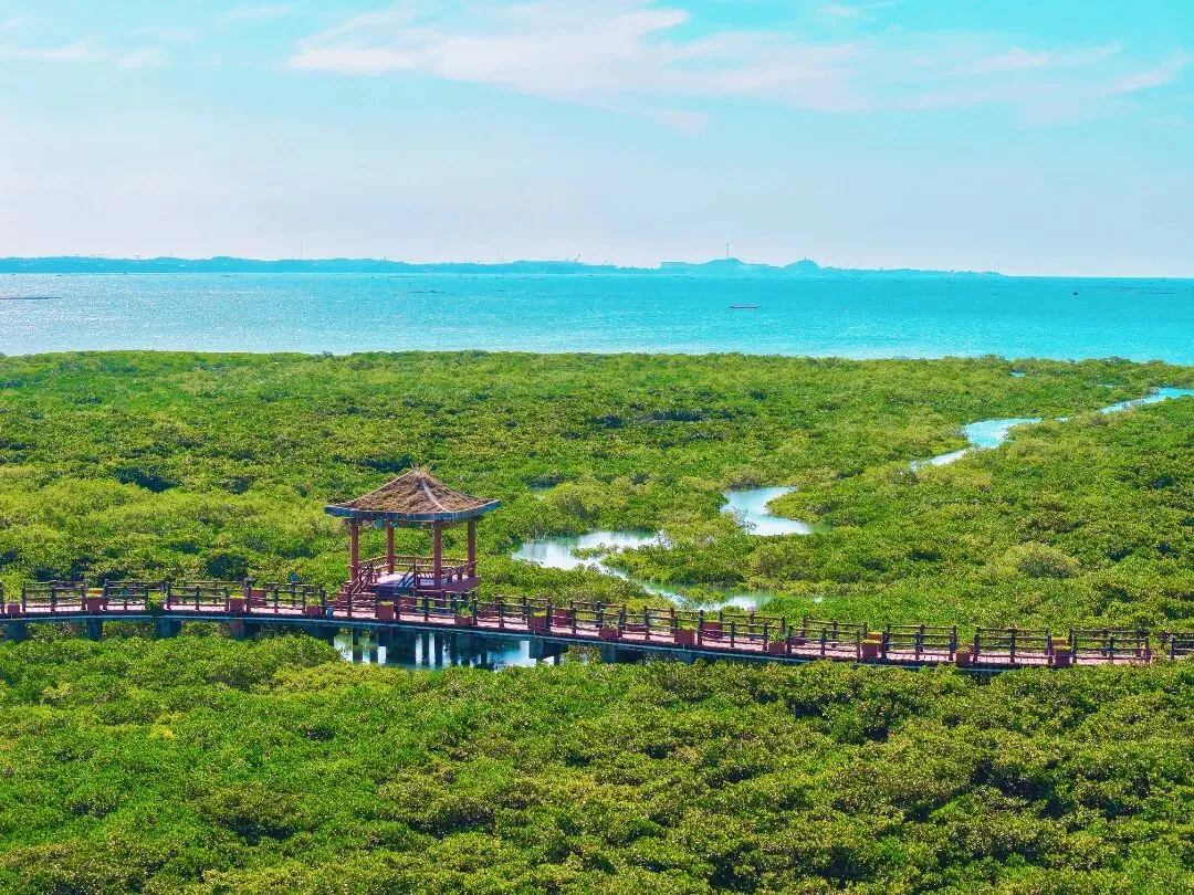 一路向南,来到了北仑河口国家级自然保护区。红树林长势茂盛,脚下是清可见底的浅滩,滩涂里充满着小螃蟹爬行的身影。极目远眺,成片的红树林郁郁葱葱,走在木栈道上,澄澈的天空与这片海岸温柔相拥。