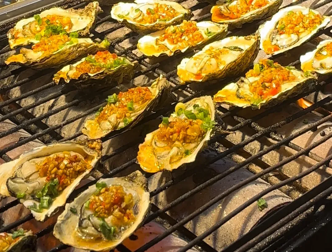 蒜蓉蒸生蚝/碳烤生蚝:本地蚝肥嫩多汁,蒜蓉粉丝蒸保留鲜甜,碳烤则带焦香,蘸芥末酱油或蒜蓉辣酱都绝(企沙海鲜市场、簕山古渔村的排档最推荐。)
