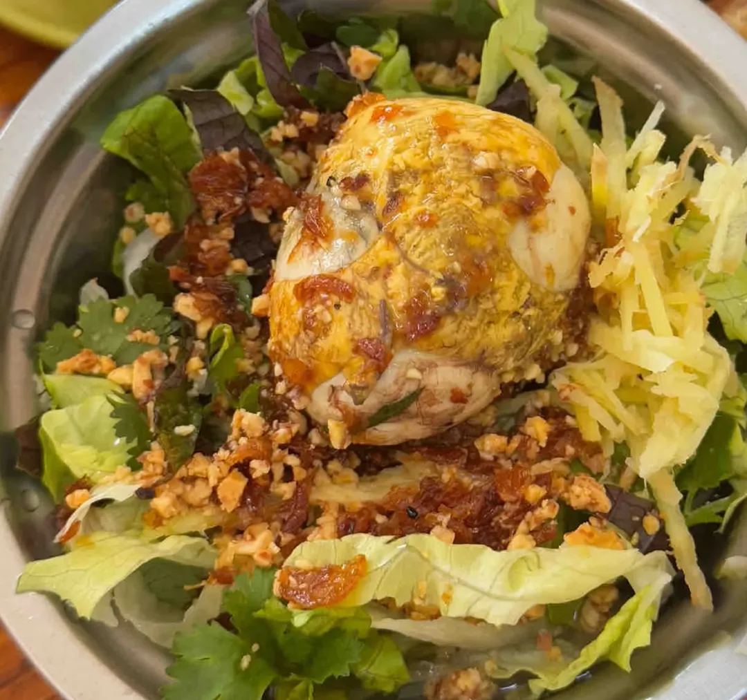 把新鲜胚胎蛋慢火煮熟,避免蛋体破裂、鲜味流失;敲开蛋壳入碗,铺香菜、紫苏、姜丝、生菜,浇秘制酸辣酱汁(多为鱼露、米醋、蒜蓉、小米辣调制),撒炸葱,再挤几滴金桔汁增香解腥;