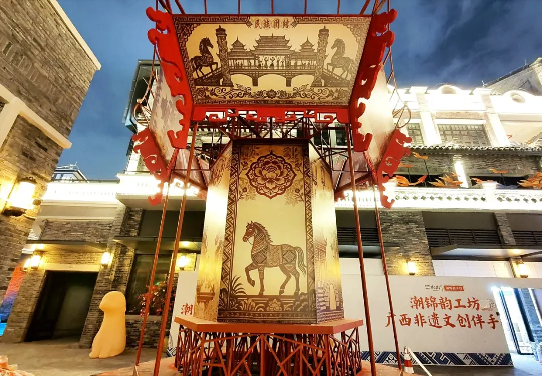 灯会主场设在邕州古城·水街片区,涵盖石巷口路、仁爱路及蜿蜒的内部街巷。20余组主题灯组分为“流光焕彩”“国风雅集”“祈福旺运”三大板块,“龙马精神”灯组昂扬大气,“马踏飞花”灯组祥瑞浪漫,“福娃闹春”“黄金树”等灯组年味十足,一步一景,步步惊喜。