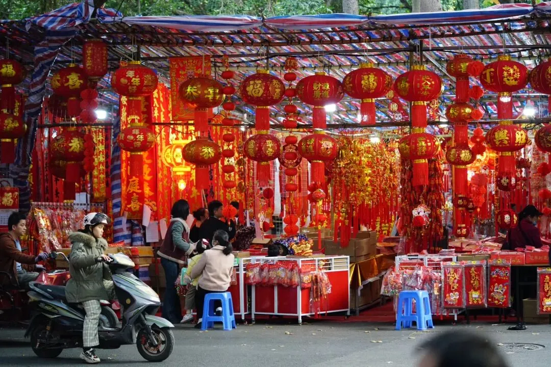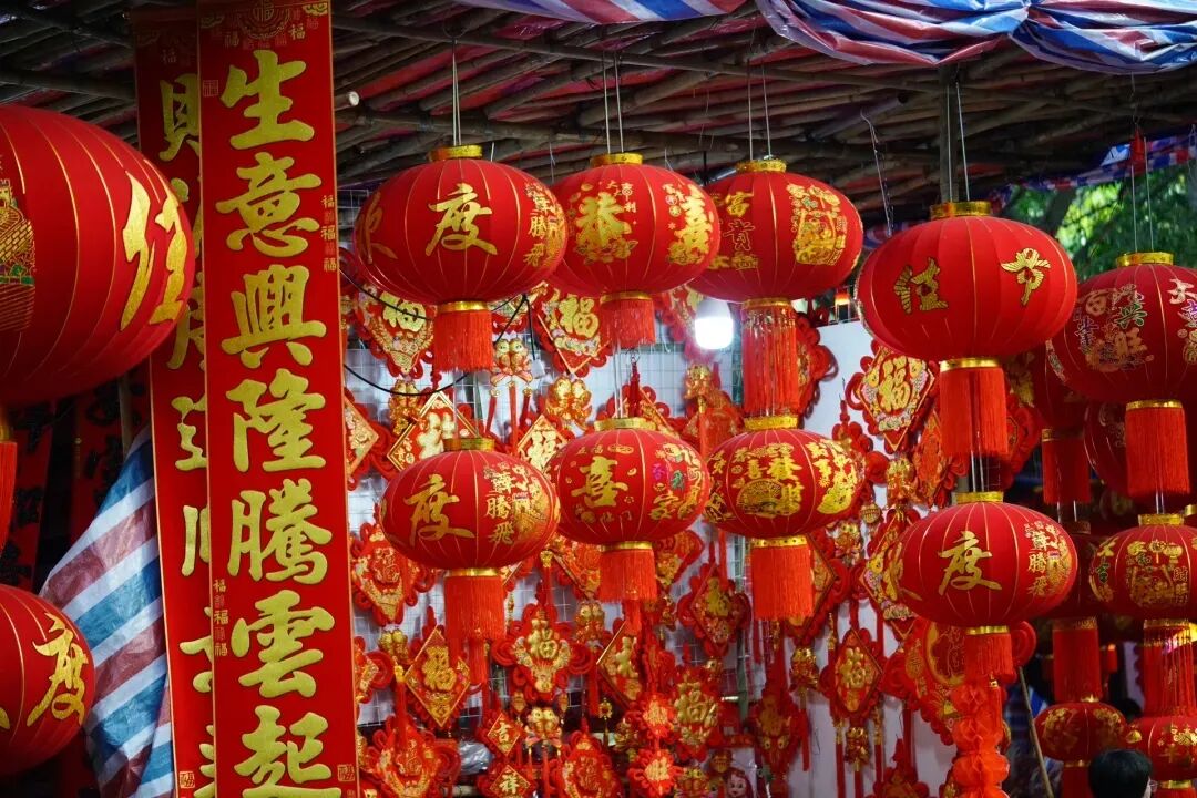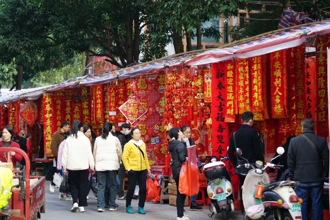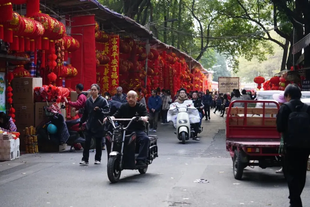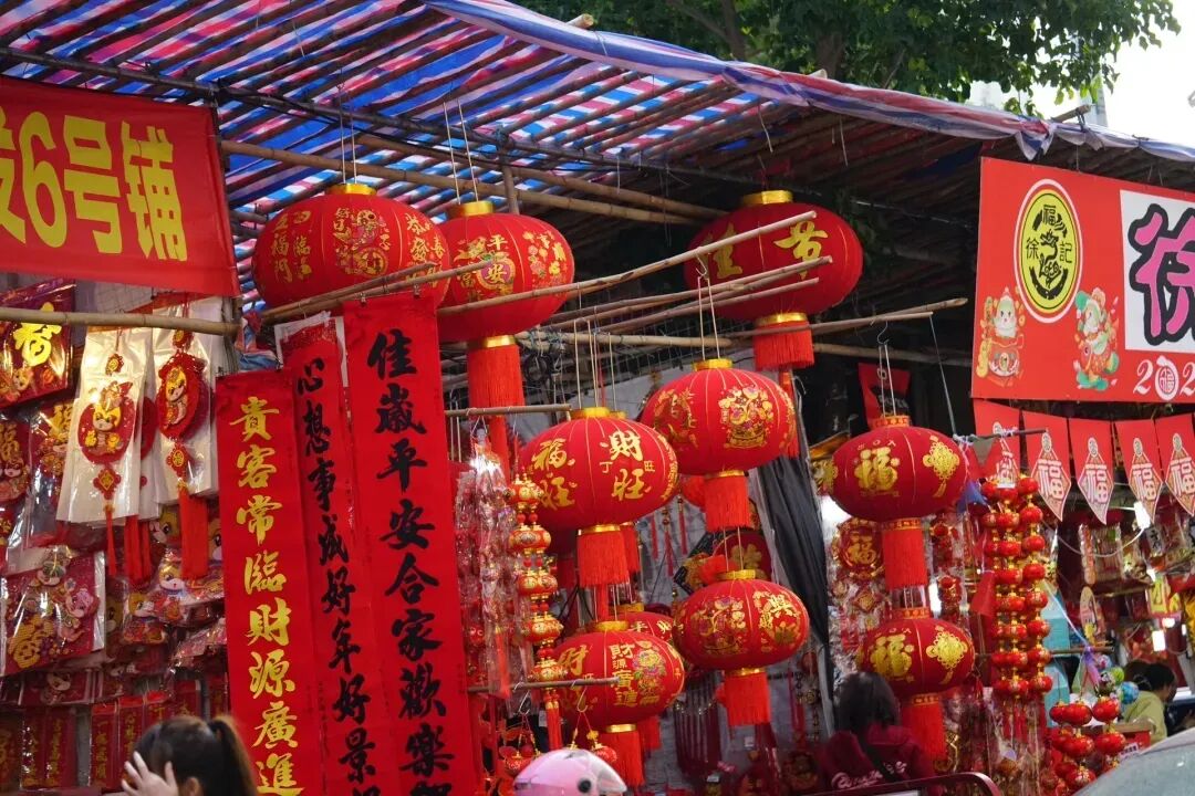 沿路摊位鳞次栉比,挂满了各式各样的春联、福字、灯笼和龙年挂饰,红得热烈、红得喜庆,让人瞬间沉浸在新春的喜悦中。