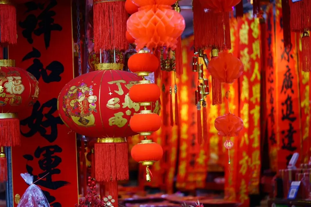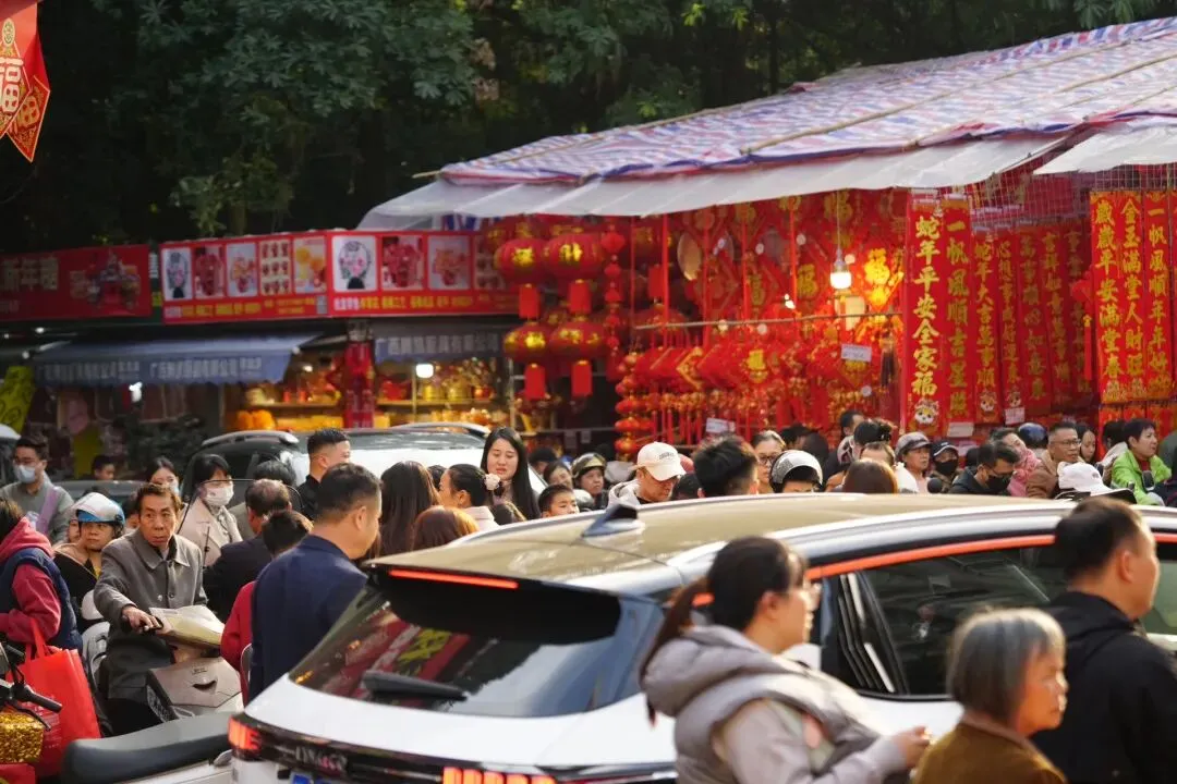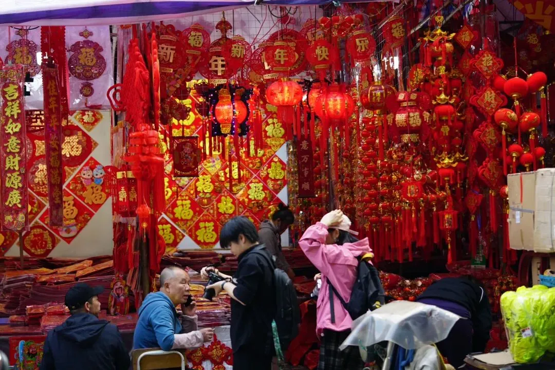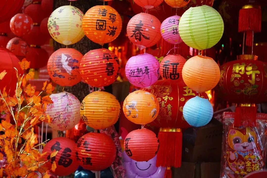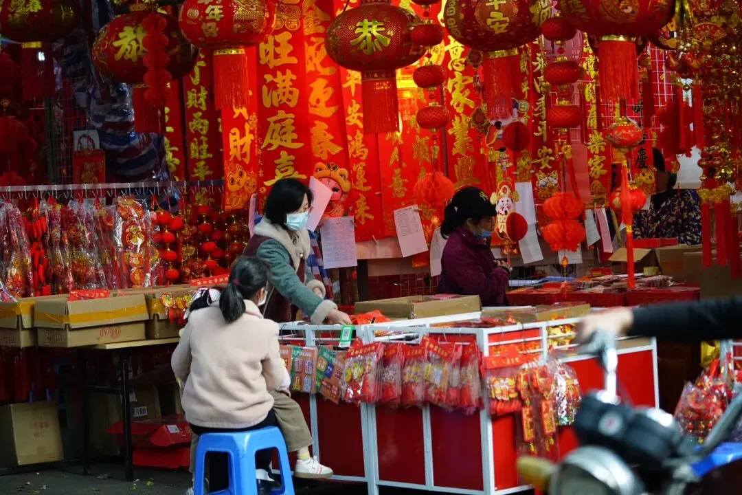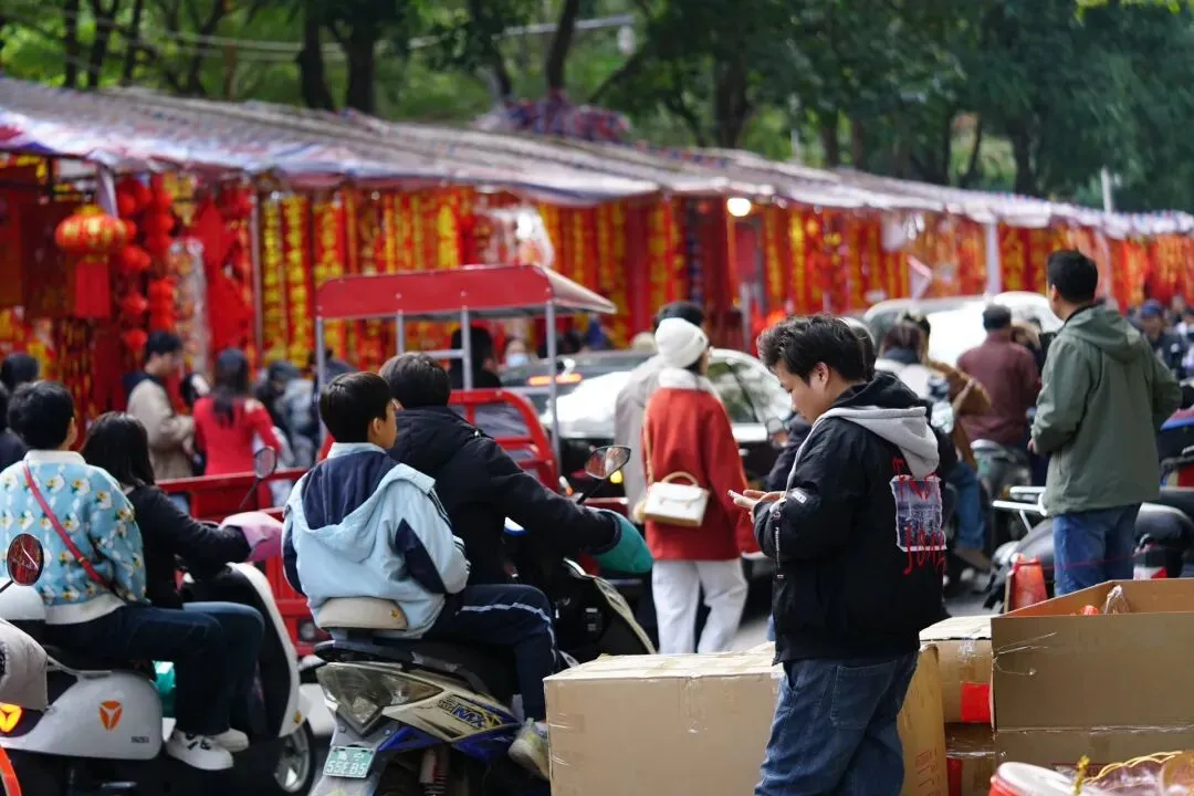 沿路摊位鳞次栉比,挂满了各式各样的春联、福字、灯笼和龙年挂饰,红得热烈、红得喜庆,让人瞬间沉浸在新春的喜悦中。
