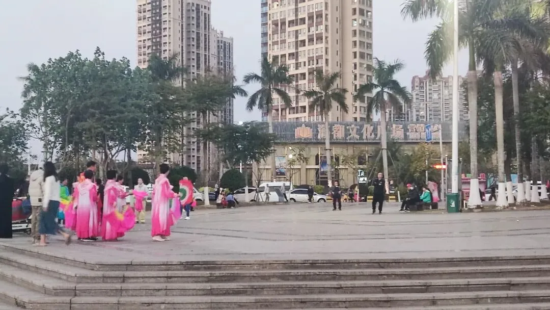 海都文化广场的傍晚,是被欢歌笑语点燃的。刚踏入广场,便被一阵铿锵的锣鼓声吸引,一群身着彩色节日盛装的居民正扭着大秧歌。她们的服装红似火、黄如金、蓝若海,裙摆随舞步翻飞,彩扇在手中划出优美的弧线,动作整齐划一,脚下的步子踩着鼓点,刚健又灵动。领舞的阿姨手中的手绢花甩得虎虎生风,身后的队伍跟得丝毫不乱,围观的游人纷纷拿出手机拍摄,偶尔有人跟着鼓点拍手叫好,广场上满是欢快的气息。这鲜活的秧歌表演,不是刻意的演出,而是居民们日常的休闲娱乐,身着靓丽泳裤的男子路过,也会笑着驻足看上几眼,市井的热闹与鲜活,在这一刻展现得淋漓尽致。
