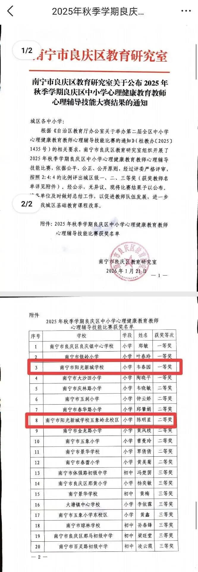 南宁市阳光教育集团阳光新城学校教师在2025年秋季学期良庆区中小学心理健康教育教师心理辅导技能大赛中获一等奖1名,二等奖1名!