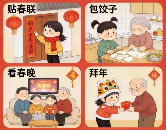 借春节团圆契机,带孩子体验贴春联、包饺子、剪窗花等传统习俗,共制年货、巧布家居,在烟火气中感受年味,传承文化暖意。