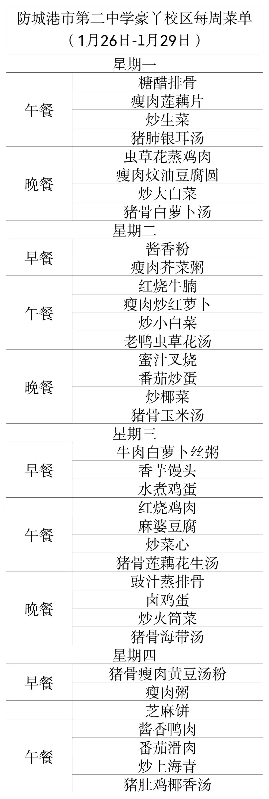 防城港市第二中学每周菜单(2026年1月26日-29日)