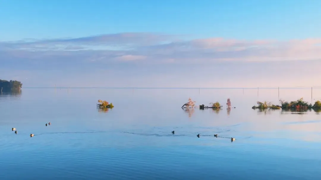 傍晚时分,成群的海鸥贴着水面盘旋,伸伸手就能和它们来个“亲密互动”;水杉林被晚霞染成暖红色,阳光透过枝叶洒在水面,很治愈。