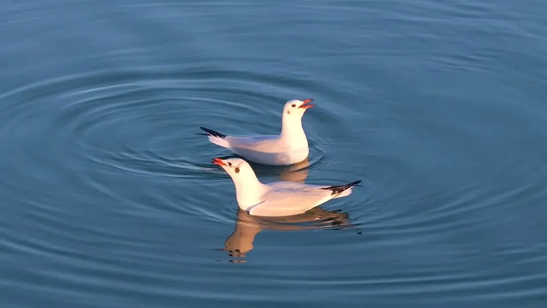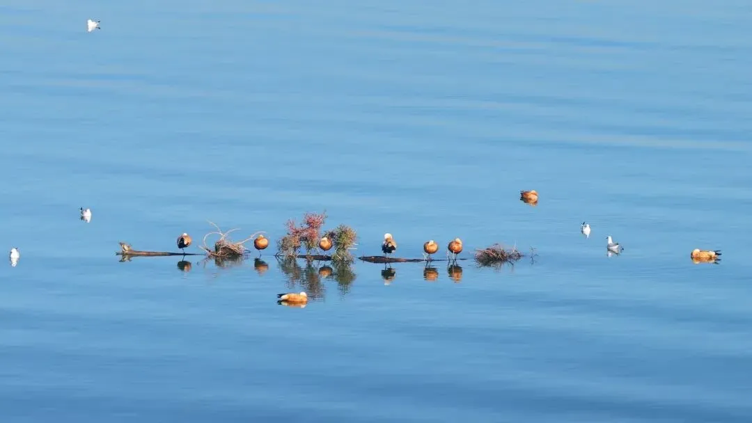 冬日阳光下,成千上万只红嘴鸥在碧波之上翩翩起舞,它们或低空掠过水面,或盘旋于人群之上。