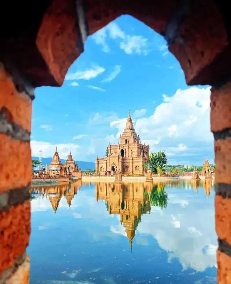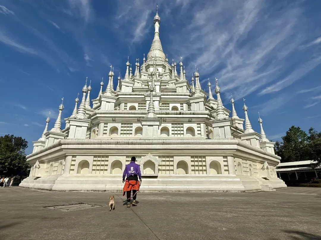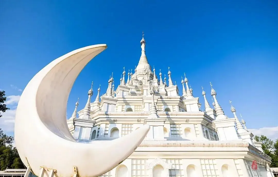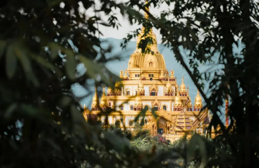 位于孔雀湖畔雷牙让山顶的勐焕大金塔是芒市地标性建筑,它是中国第一金佛塔和亚洲第一空心佛塔,傣族人民的圣地。