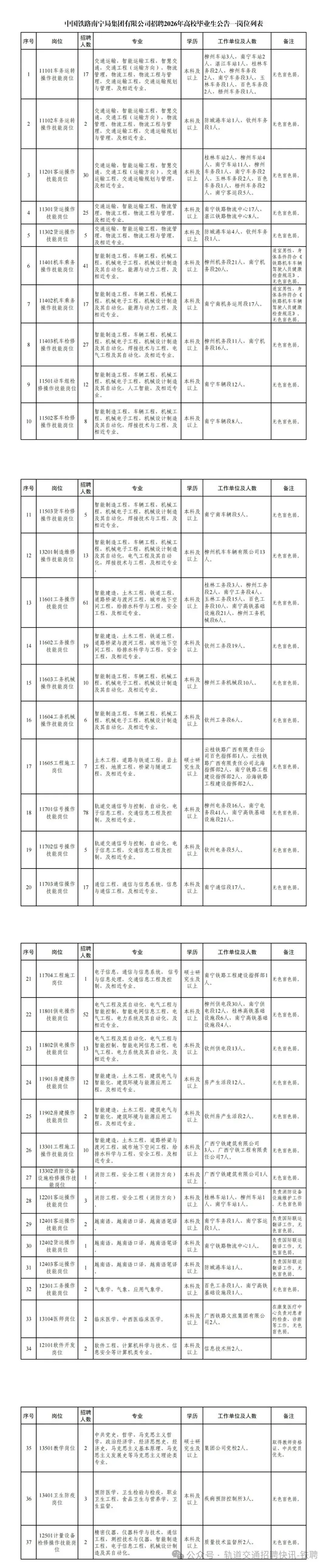 本次计划招聘516人,具体招聘岗位、专业、人数详见附件《中国铁路南宁局集团有限公司招聘2026年高校毕业生公告一岗位列表》。