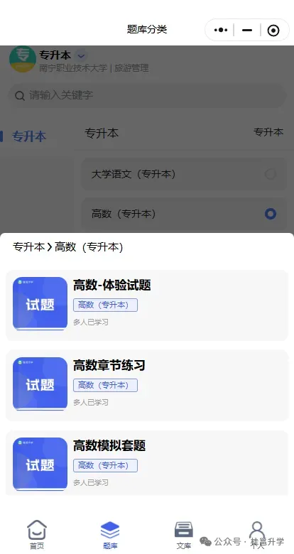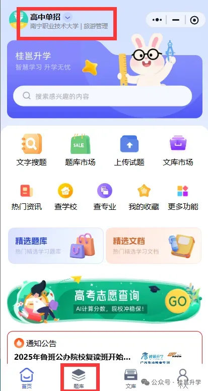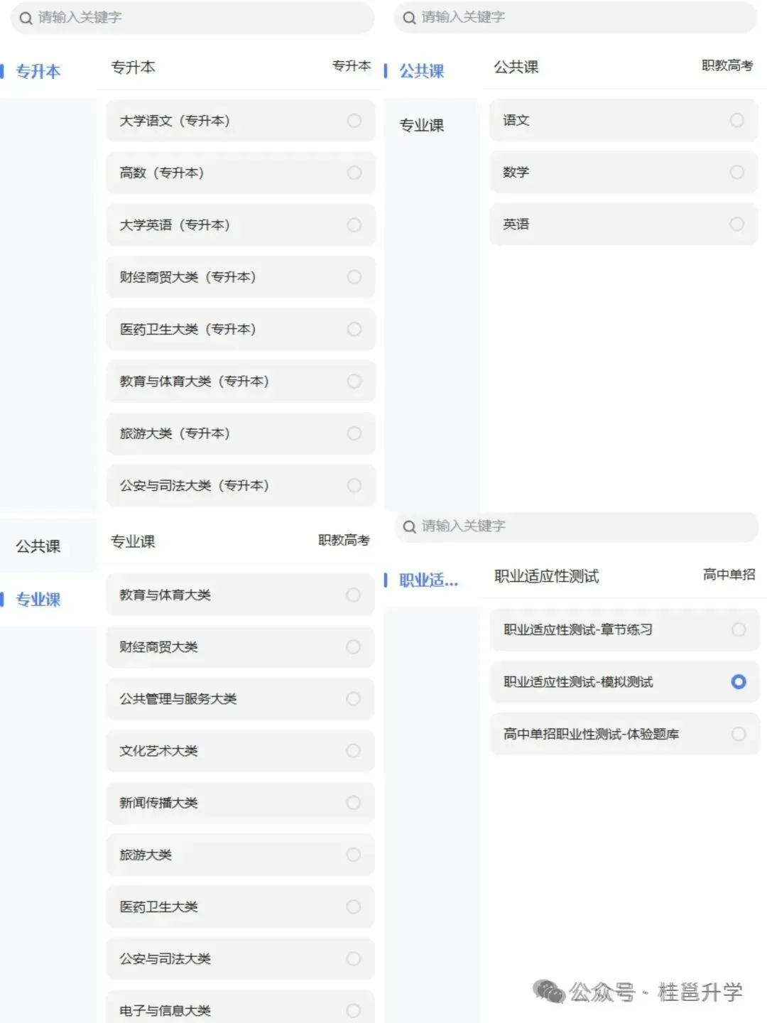 单招职测+对口/专升本 语文+数学+英语+19个专业大类题库应有尽有每道题都针对校园学习场景打磨:不管是课后巩固的基础题、考前复习的高频题,还是往年考试真题,覆盖所有学考专业,所有年级备考需求,不用再切换多个平台找题,打开桂邕刷题小程序就能沉浸式刷题。