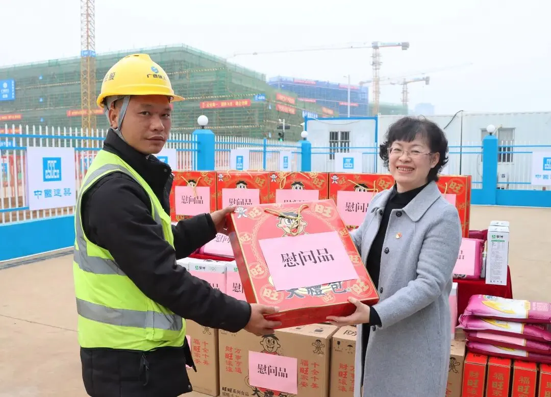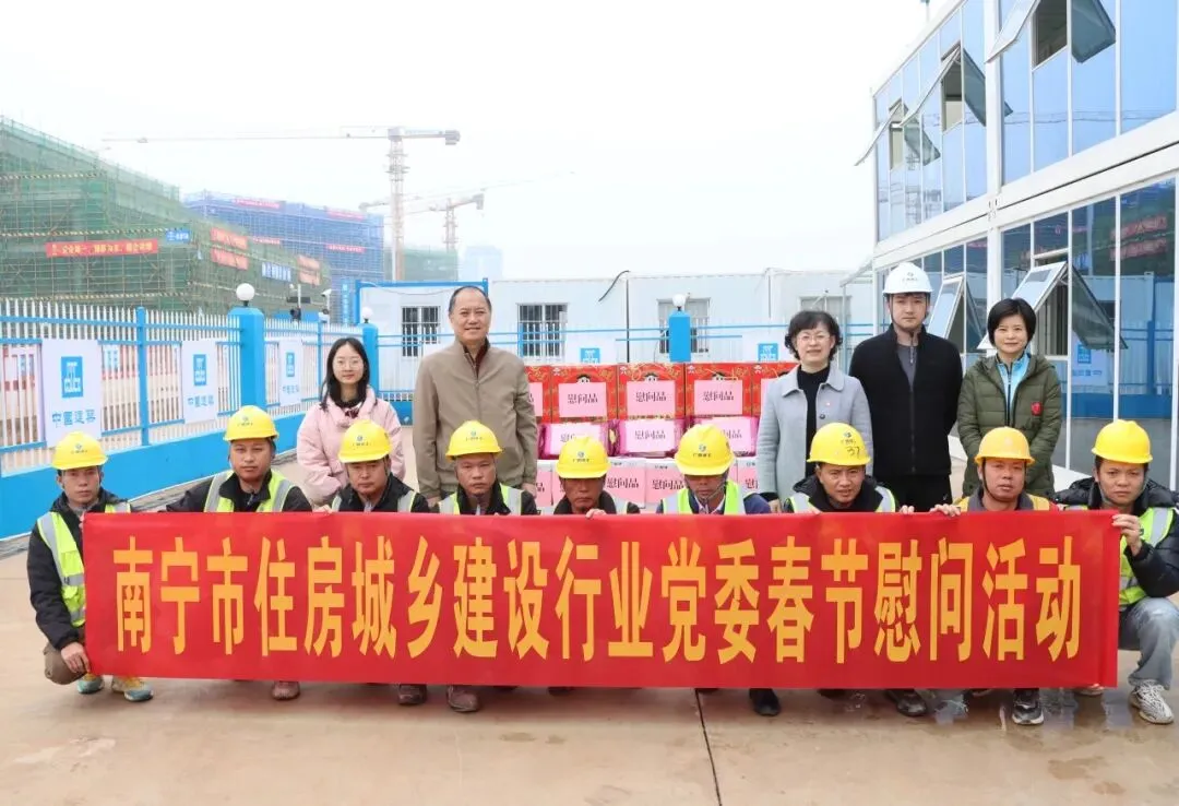 南宁市住建行业党委孙庆柳、杨悦、黎婉婷,五分公司综合办公室、项目部相关人员和工友代表参加慰问活动。