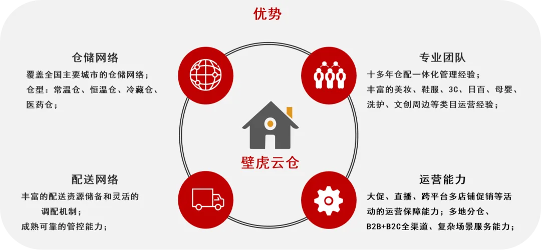 壁虎云仓服务于多家上市企业、品牌公司和电商大卖家,在规模性、综合性、复杂程度高的大型仓储配送项目上积累了丰富的运营管理经验;壁虎云仓尤其擅长多平台、多店铺、多场景的仓配大项目运营,为美妆、鞋服、3C、母婴、食品、日百、洗护、文创周边等多个行业,提供B2B+B2C仓配一体化解决方案及高效的物流履约保障,为品牌方全渠道销售助力。