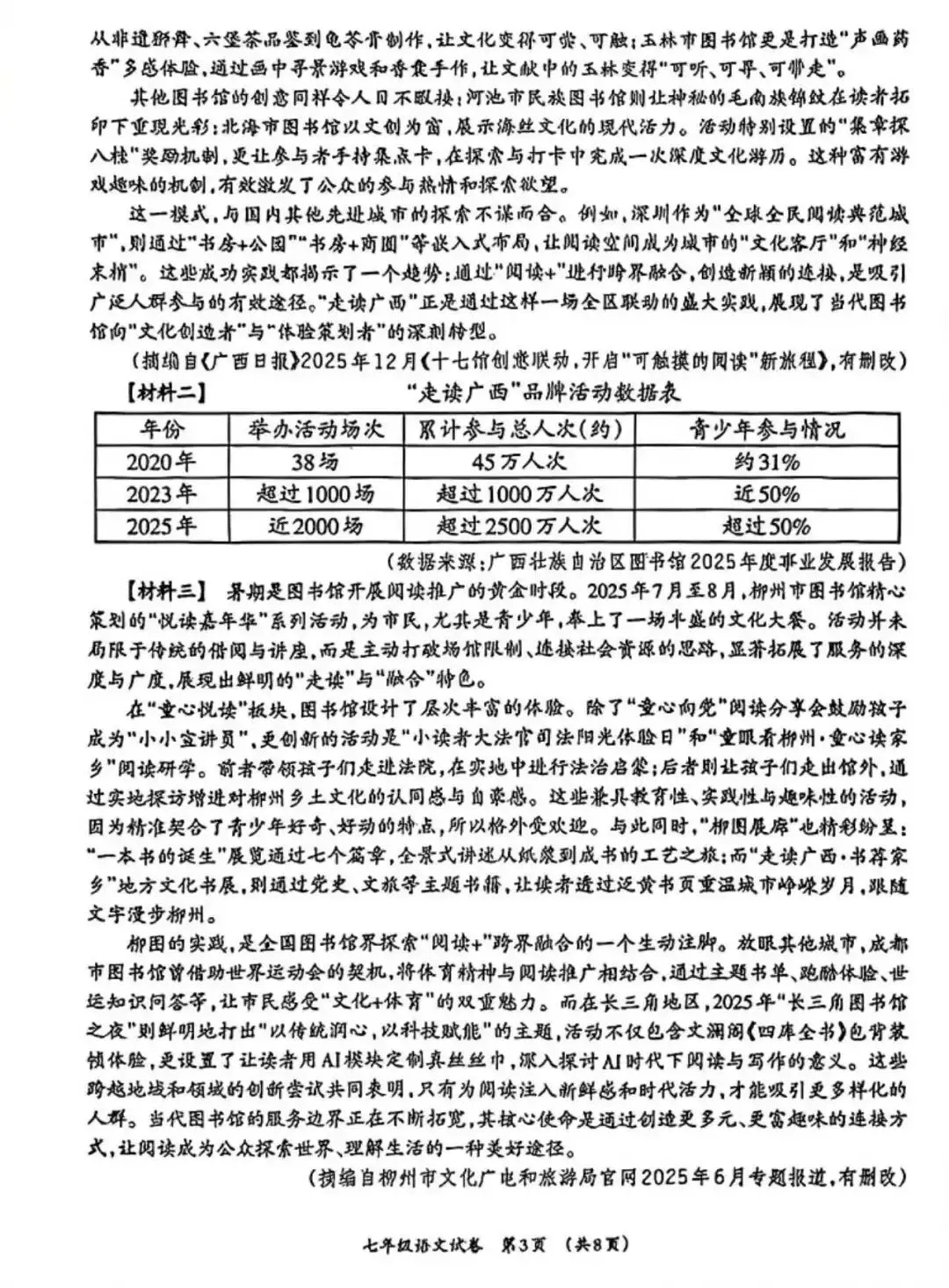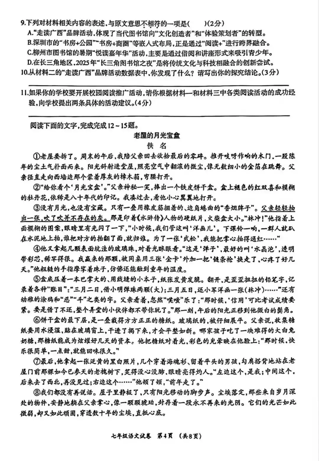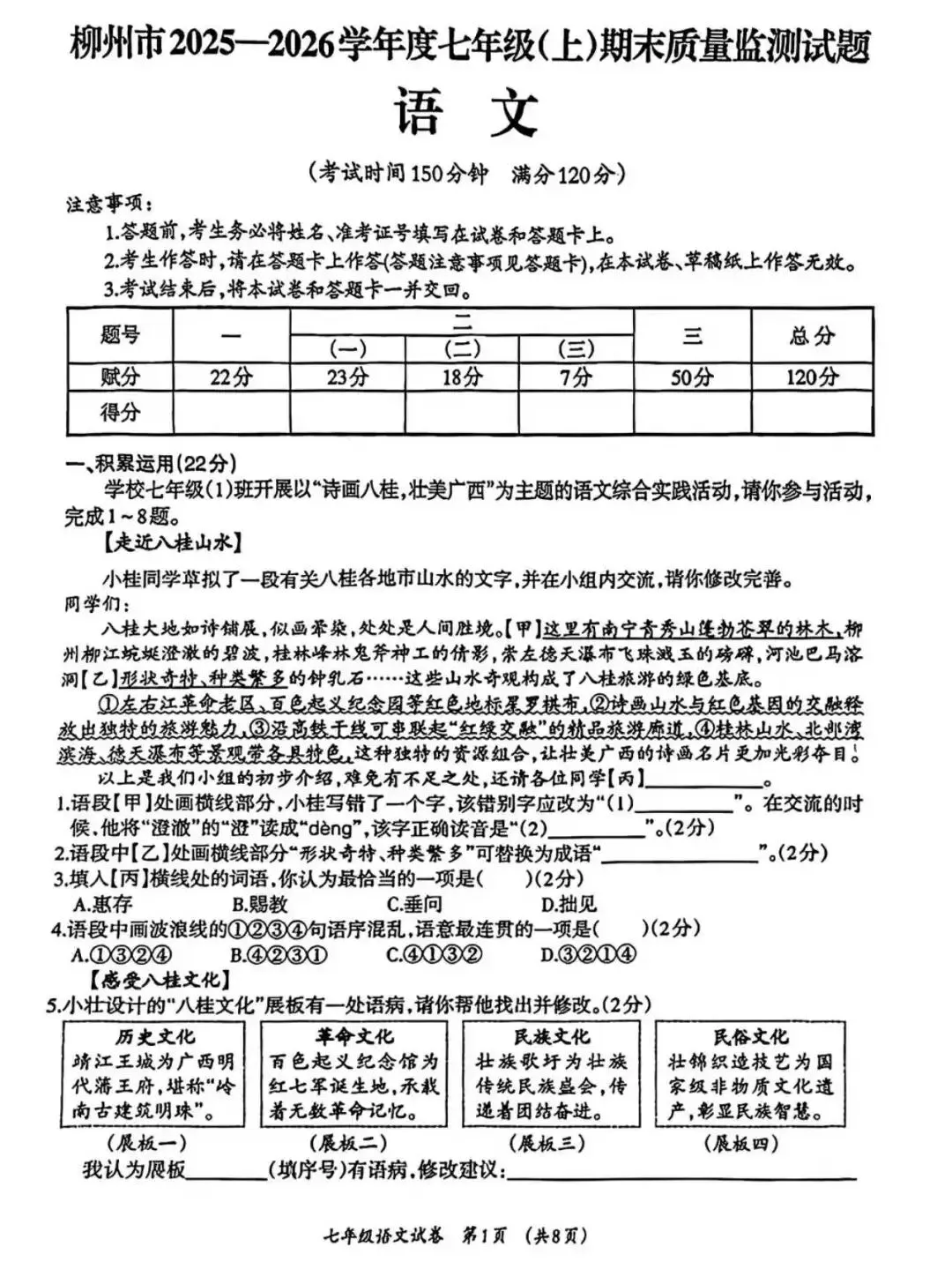 柳州市七年级语文上册期末考试的命题思路发生明显转变:通过增加主观题、缩减客观题的方式,更聚焦于学生生活经验的积累与个性化观点的表达,强调语文学习与现实生活的联结。