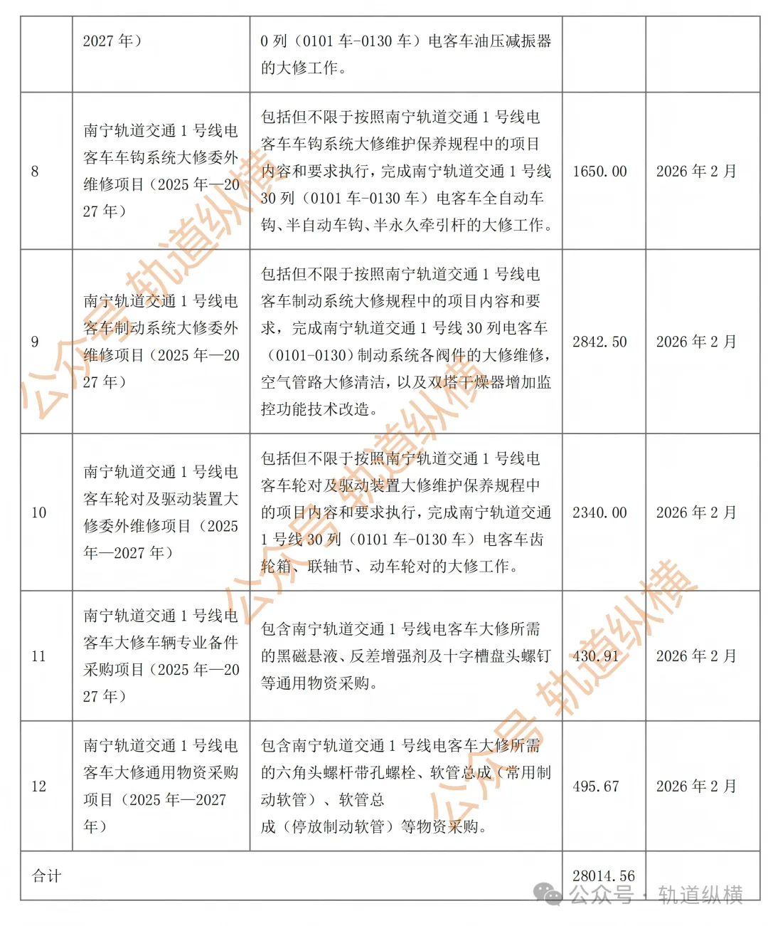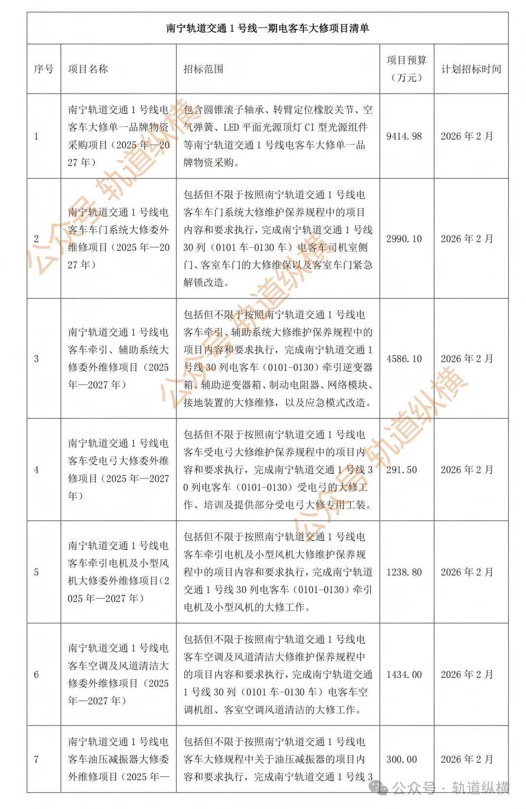 南宁轨道交通运营有限公司拟于近期开展南宁轨道交通1号线一期电客车大修项目招标工作,为便于投标人及时了解招标信息,现将本项目招标计划公布(详见下表):
