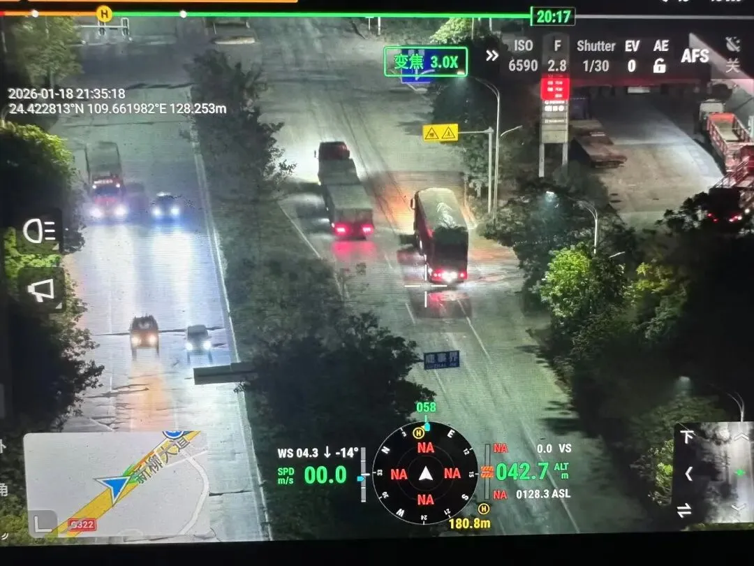 柳州交警深度应用无人机技术,使其从“空中眼睛”升级为“会思考的空中智慧节点”。在重点违法整治中,无人机凭借高空广角视野和灵活机动性,构建起“空中巡航预警、实时指挥调度、地面精准查控”的三维作战模式,有效破解了违法车辆“躲猫猫”、执法盲区存隐患的难题。在应急处突中,无人机更是“先锋官”。在一次重大交通事故现场,无人机率先抵达,快速三维建模还原现场,协助后方远程精准制定救援与交通疏导方案,并通过高空灯光、喊话引导救援车辆、疏散围观人群,为生命救援争取了宝贵时间。