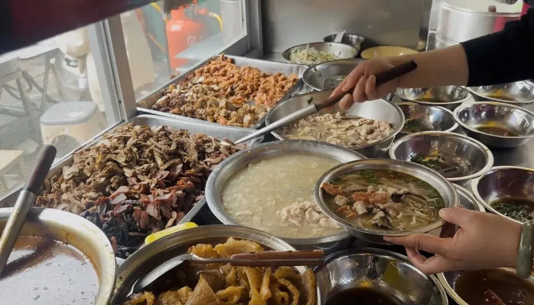 刚到谷埠市场,就被一家爆满的切粉店吸引。排队时摸清了规则:先选切粉或榨粉,再挑口味,最后自助加小菜。