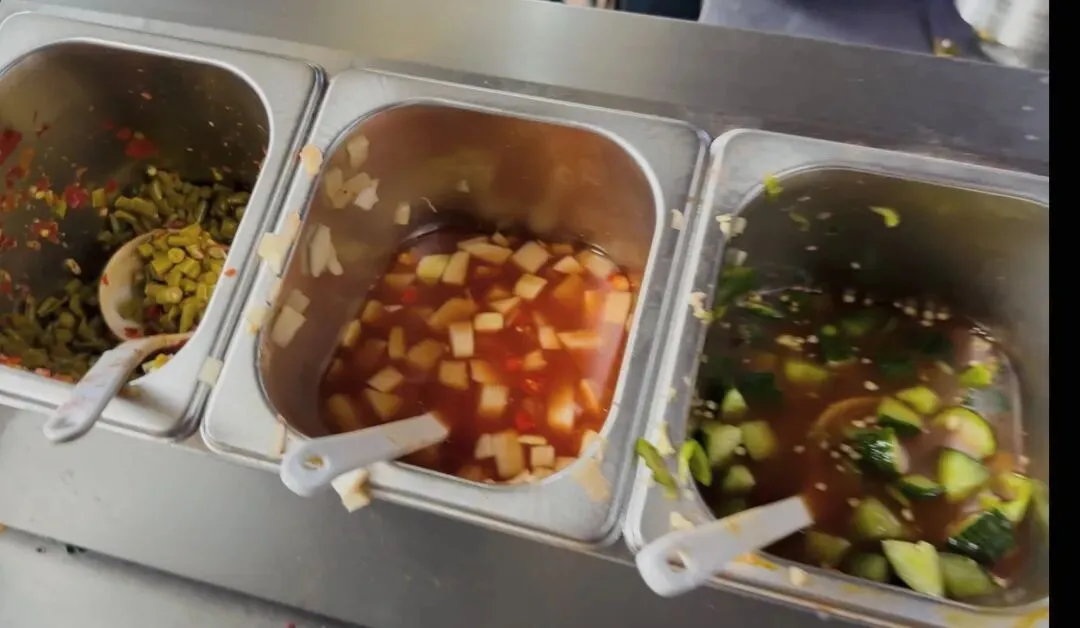 然而接下来,竟然还有酸豆角、酸萝卜、酸黄瓜、酸笋、拌苦藠这几种小菜,可以随便加。每一样看起来都很好吃,我每样都加了一点。