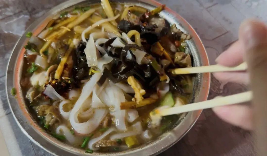 端碗开吃,瞬间被惊艳:配菜香脆鲜嫩,浓郁汤汁裹着软嫩口感的切粉,酸香交织着糊辣椒油的香气,层次丰富到欲罢不能。