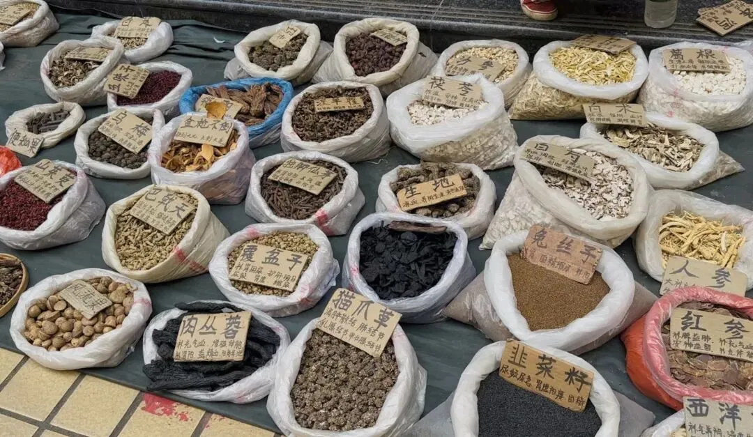 市场里还藏着超多中药材店,品种多分量足,我们还见到了茶麸和不知名野果。