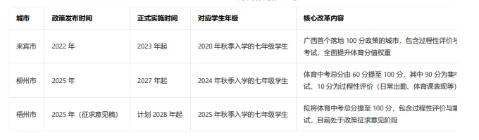 2025年6月18日,柳州市已官宣体育中考分值提至 100 分(从2027届起实施),与物理、化学等主科同分;梧州市也在同年1月发布过体育中考改革征求意见稿,而来宾市已于2023年正式实施体育中考100分政策。