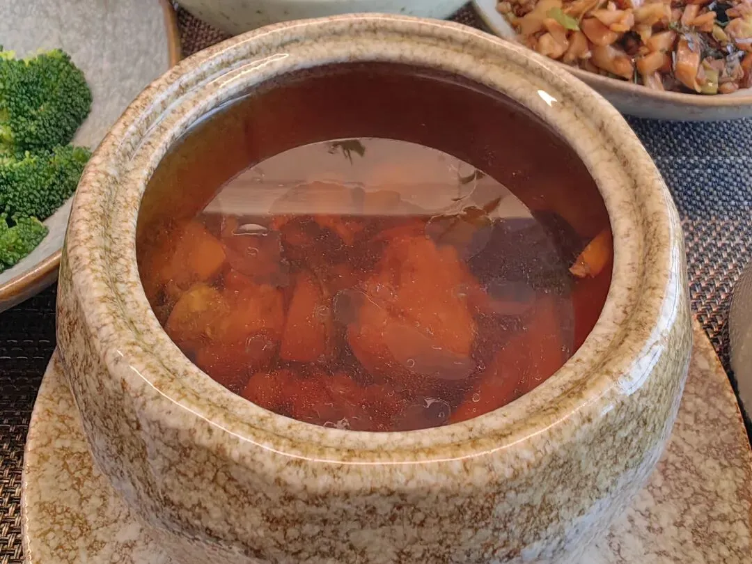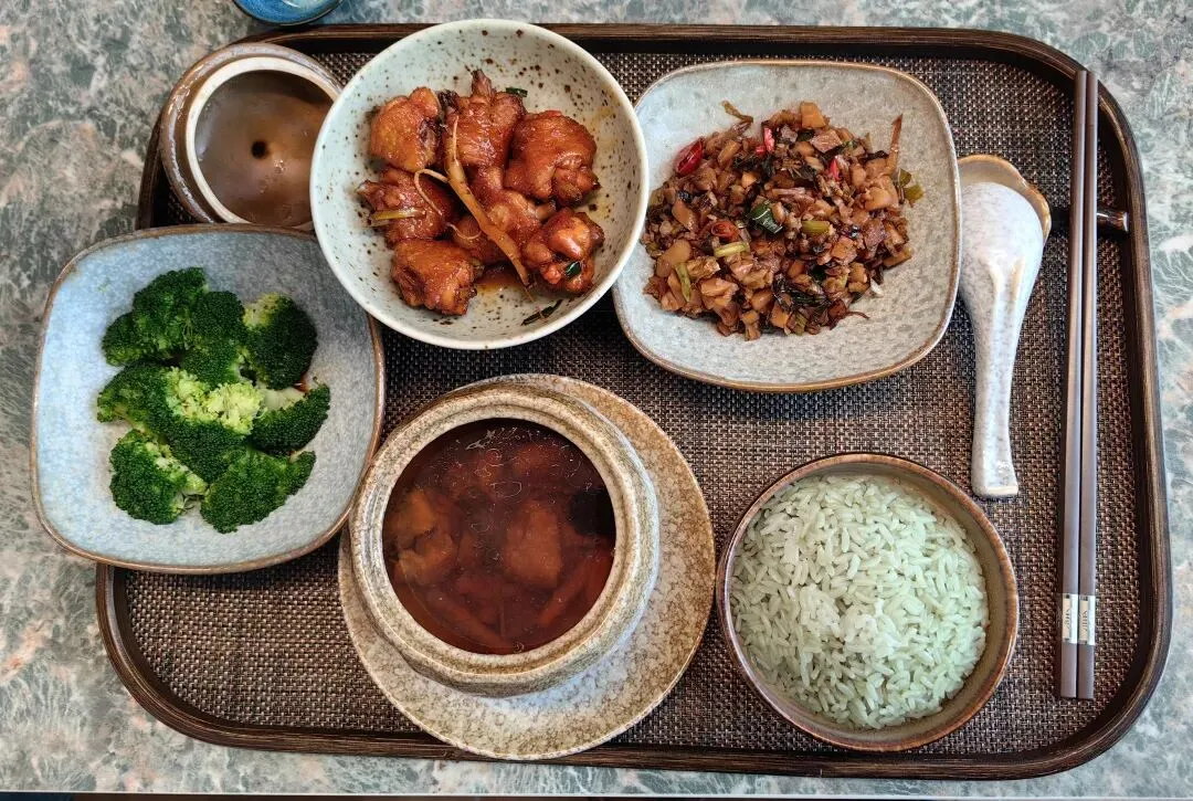 馆内外郁郁葱葱,精致优雅。深秋雨中,全不见萧瑟,如夏意热烈。夏季是蝉用十几年时间写一首短暂而热烈的诗。蝉季非四季,数年乃至十数年蛰伏地下,以若虫存,是漫长黑暗的冬季;忍耐和等待,至春夏之交,破土而出,攀上树枝草叶,蜕而成虫,是华丽变身的春季;成虫的生命热烈而短暂,沐浴阳光,全力鸣叫,尽情歌唱,生命最辉煌的时刻,是繁衍生息的盛夏。然后使命完成,生命迅速走向终点,是极短暂的秋季,没有收获,只有终结。曾在太原龙山石窟山间林道树上,看到体型硕大的蝉,异常响亮的鸣蝉,兀自欢歌,不惧亦不理旁人。 忽然想到,考终命即是安乐死,在生命嬗递的高潮中,此一灭,彼一生,生死交接,无生无死,没有轮回。生如夏花之绚烂,生活就得经历等待厚积薄发的蛰伏。从这个意义上看,道家的淡泊无欲、静居修行、飞升成仙,才是蝉季生活外化。 蛰伏时,或说休养生息时,来蝉季生活馆吃快餐。人若如蝉,此时尚须潜蛰。食不宜多,少而精,阴阳均衡。 人参鸽子鲍鱼汤,还有党参虫草花枸杞等同煲。清润醇厚,肉汤味比药膳味略重,肯定滋补。中医院药膳坊的养身汤则中药味浓郁些。以药材入汤,岭南炖盅常见,说到养生汤,必得有食药同源之物。 红烧鸡翅,鸡翅斩块,易入味。素为白灼西蓝花,浇少许酱汁。肉末头菜,好下饭。膳食结构配得上,只是没觉出多少药膳味。或说养生滋补除了汤,并不凸显。 米饭淡绿,言以密蒙花和蝶豆花配熬做汁,烹成绿色米饭,清肝明目。密蒙花俗名染饭花、黄饭花,向来用以染糯米饭,端午壮家五色饭,必用到密蒙花。蝶豆花护眼抗炎,为蓝紫色。蓝与黄配,恰为绿色。米饭甚好,只是干了点。 据说此地有数十种养生汤,菜品则每餐不同。食友言,下班来吃个快餐,洗个头,刚好得一个午觉。安排合理,只是价格不菲,需量力而行。