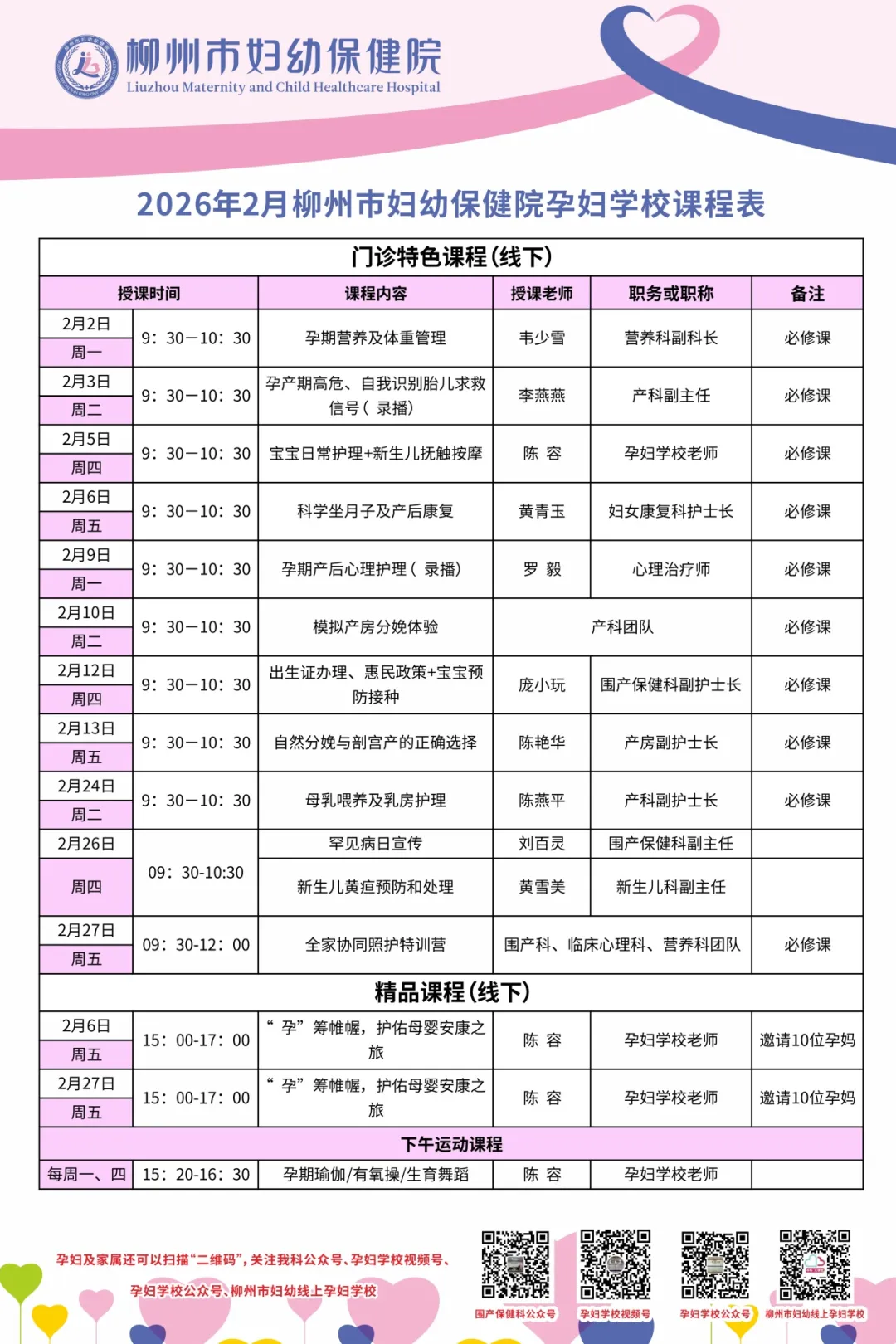 下面是孕妇学校2026年2月份课程表,各位准妈妈和准爸爸快收藏,记得准时来上课!