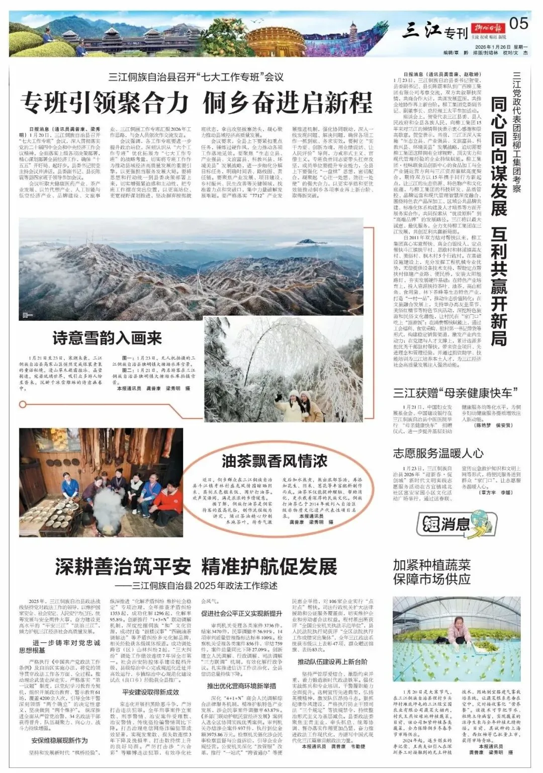 2025年,三江侗族自治县政法战线坚持党对政法工作的领导,以维护国家安全、社会安定、人民安宁为己任,统筹发展与安全两件大事,奋力建设更高水平的“平安三江”“法治三江”,倾力护航三江经济社会高质量发展。