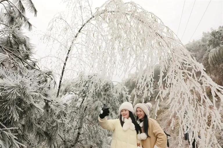 1月21日至23日,寒潮来袭,三江侗族自治县高寒山区悄然变成银装素裹的童话秘境,漫山草木凝霜挂冰、晶莹剔透,宛若琉璃世界,吸引众多游人纷至沓来,沉醉于冰雪雕琢的诗意画卷中。