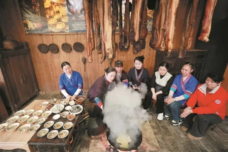 近日,侗乡群众在三江侗族自治县斗江镇牙林村盛龙风情园晾晒阴米、蒸制五色糯米饭、围炉打油茶。欢声笑语间,满是浓浓的乡情暖意。