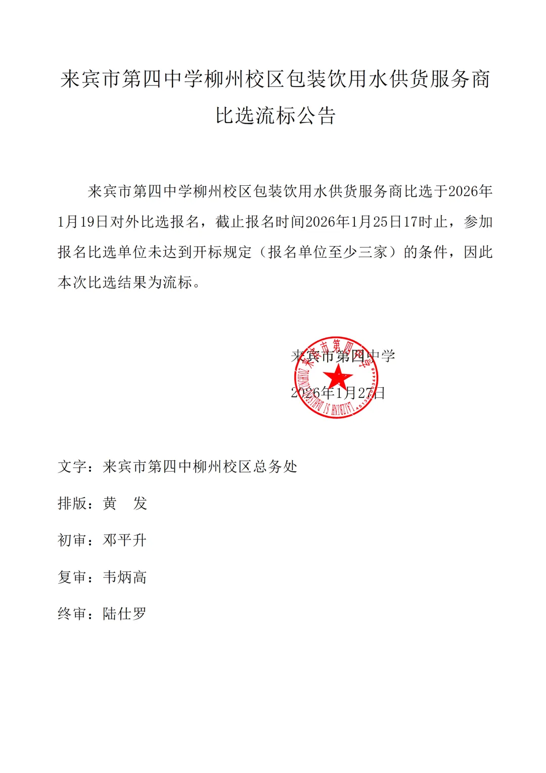 >来宾市第四中学柳州校区包装饮用水供货服务商比选流标公告