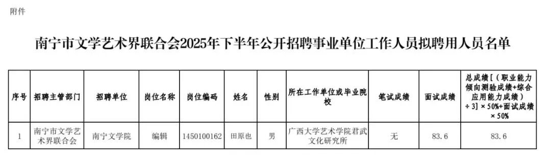 附件:南宁市文学艺术界联合会2025年下半年公开招聘事业单位工作人员拟聘用人员名单