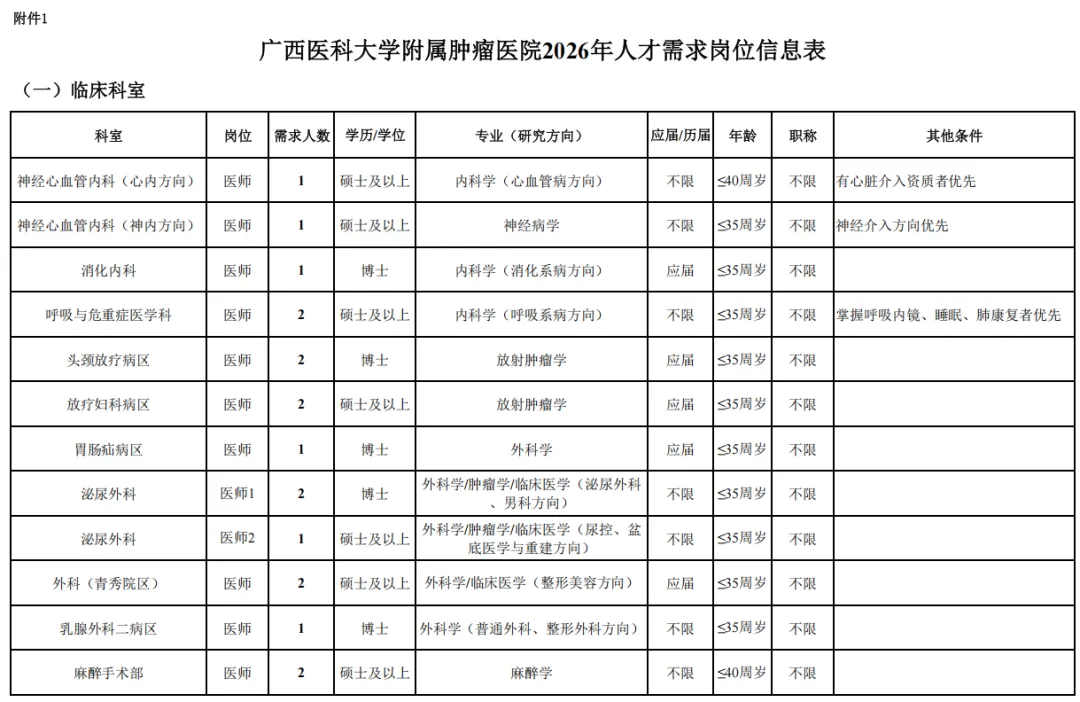 具体岗位需求详见《广西医科大学附属肿瘤医院2026年人才需求岗位信息表》(附件1),临床、医技科室长期招聘博士,不受岗位招聘计划的限制,可在医院官网查看广西医科大学附属肿瘤医院博士人才需求信息http://www.gxmuch.com/Item/10888.aspx 。