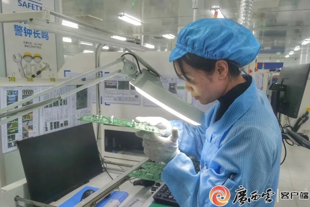 广西思必驰科技有限公司的员工,正在检查用于新能源汽车语音交互认别的芯片板。广西云-广西日报记者 黎静 摄