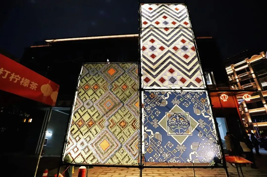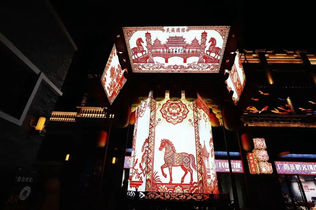 灯会中,壮锦的经纬纹路、铜鼓的经典纹样、民族服饰的绚丽色彩等广西元素被巧妙融入设计,在光影流转中诉说着壮乡故事。
