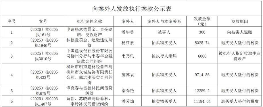 柳州市柳北区人民法院关于向案外人发放执行案款的公示(2026年第5期)