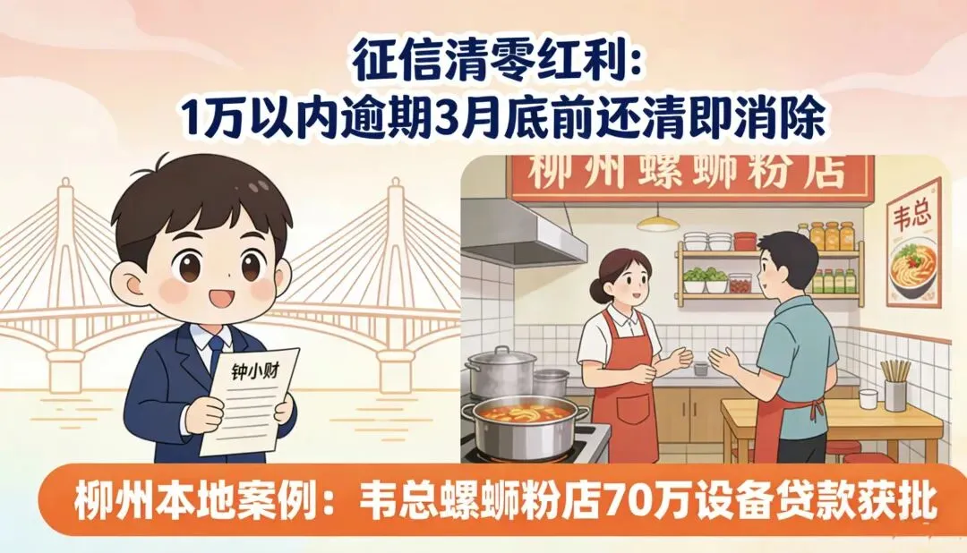 柳州的中小企业主、个体商户注意了:2026年开年,生意人的融资政策,迎来了前所未有的大利好!征信放宽、利息大降、审批提速,还有柳州本地专属贴息政策,国家统统帮你考虑到了。小财的这篇文章,帮老板们把所有红利讲透,看完直接去办,别等政策窗口期过了再后悔喔!现在距离过年,也就20天了,小财的咨询服务可以一年365天全天候,但是人家银行可是要提前预备春节团拜,过节活动……也就是大年25这样,他们就不愿接单了,大家真的要抓紧时间了。一、征信“清零”红利:1万以内小额逾期,3月底前还清就消除!