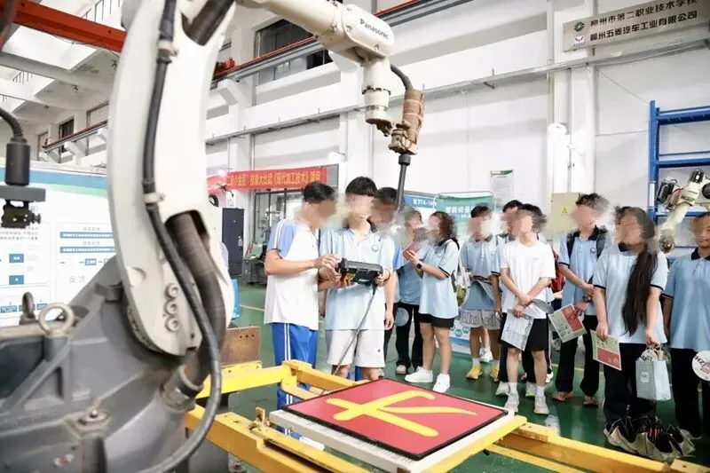 参观学生操作机械手臂