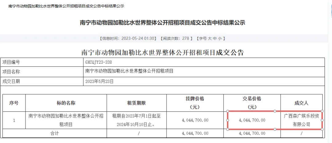 2023年5月,该项目租给广西森广娱乐投资有限公司,租金约404万,租期为2023年7月至2024年10月;
