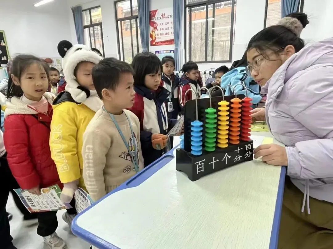 “神奇的数字”关卡前,孩子们化身小小数学家!大家随机抽取数字卡片,小心翼翼地在计数器上拨出对应数字,随后条理清晰地说出这个数的组成。从个位到十位,每一颗算珠的拨动,都是对数字概念的深刻理解,尽显数学学习的扎实功底。